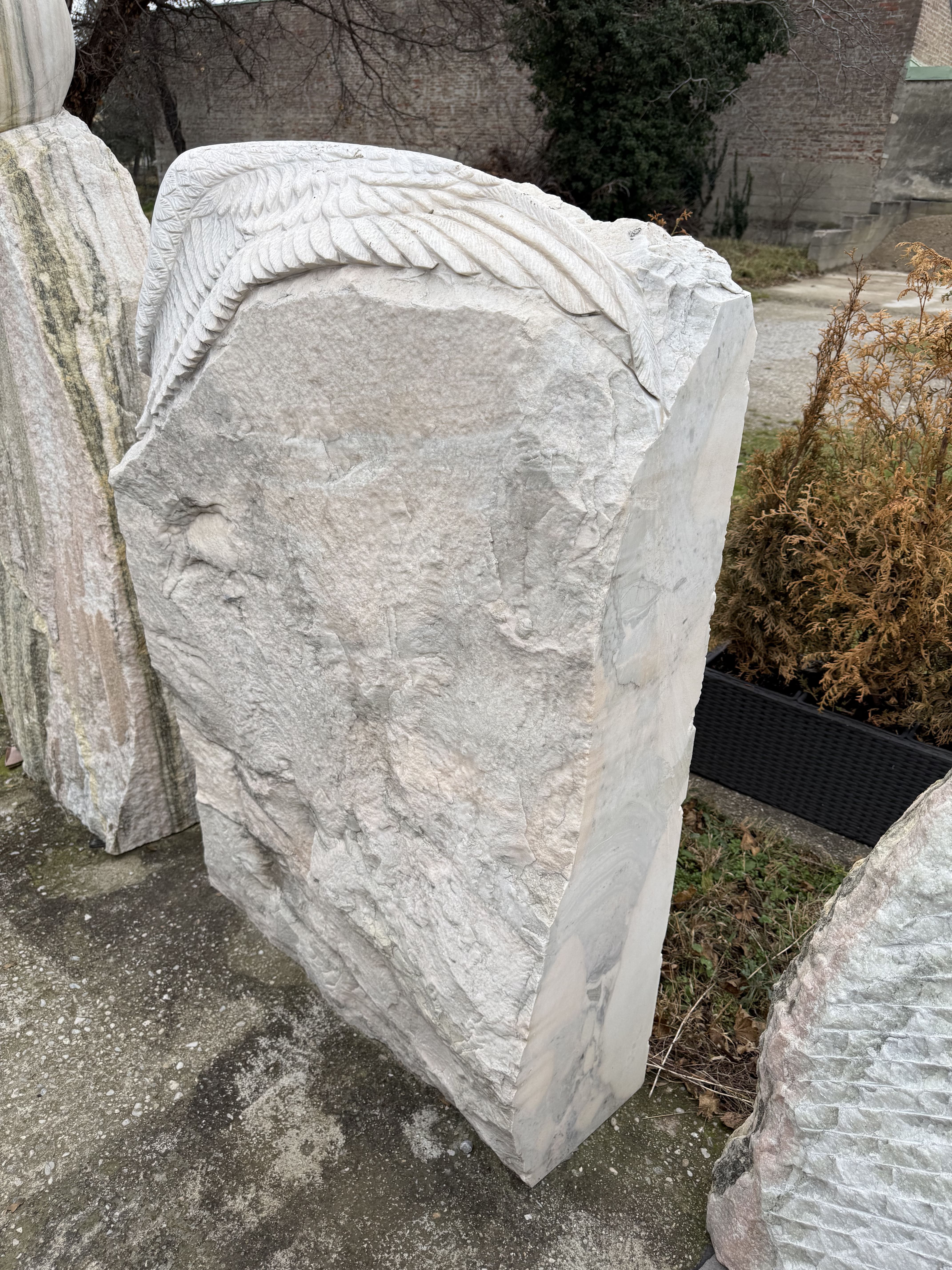 Dieser besondere Grabstein Felsen mit Flügel aus edlem Estremoz-Marmor ist ein berührendes Zeichen der liebevollen Erinnerung. Die naturbelassene, raue Oberfläche des hellen Natursteins harmoniert auf einzigartige Weise mit dem kunstvoll handgearbeiteten Flügelrelief. Dieses sanfte Detail steht als Symbol für himmlischen Schutz, Geborgenheit und unvergängliche Hoffnung. Als stilvolles Denkmal fügt sich dieses Grabmal friedvoll in die Ruhestätte ein und bietet Angehörigen einen tröstlichen Ort des ewigen Gedenkens.