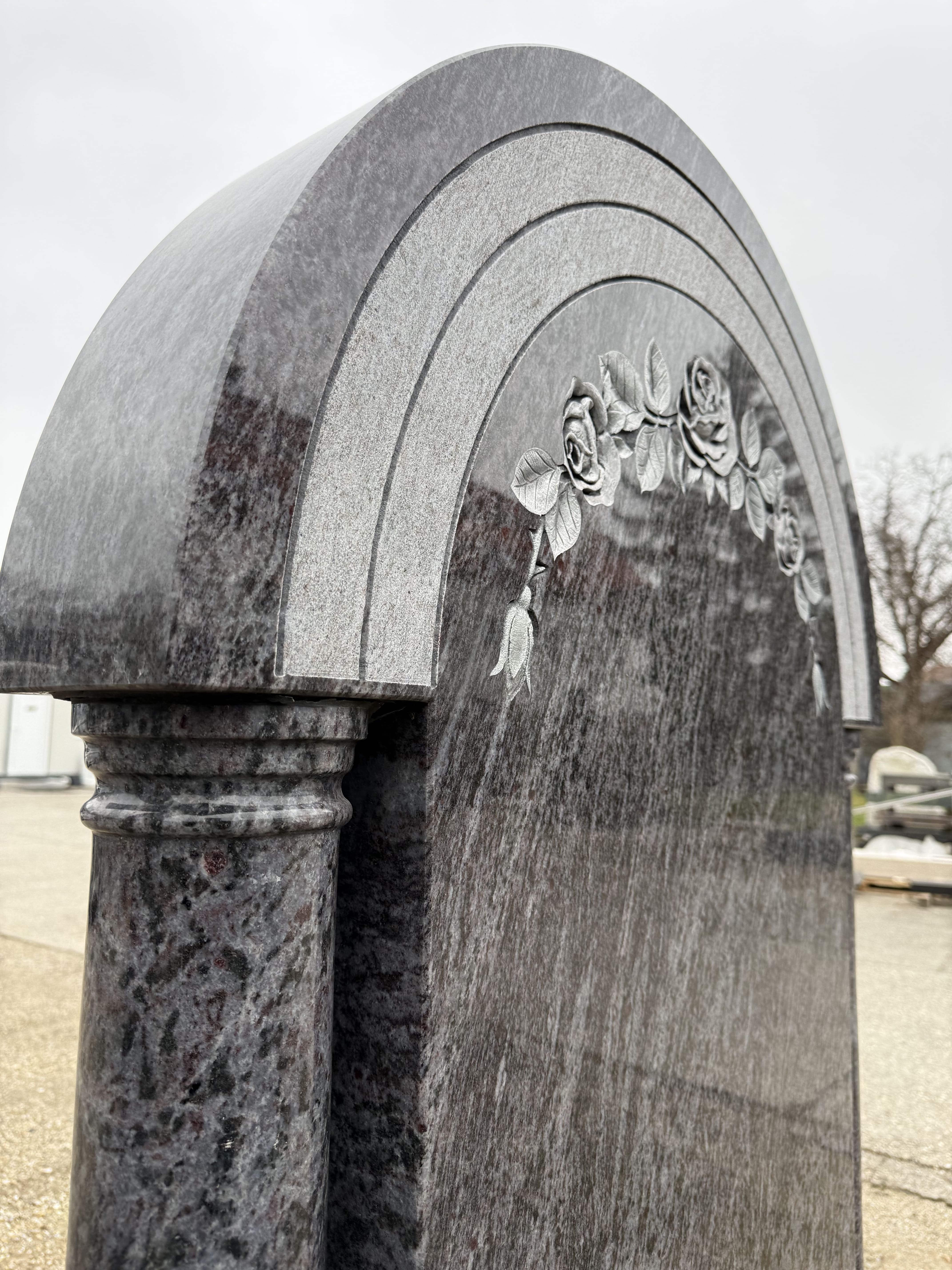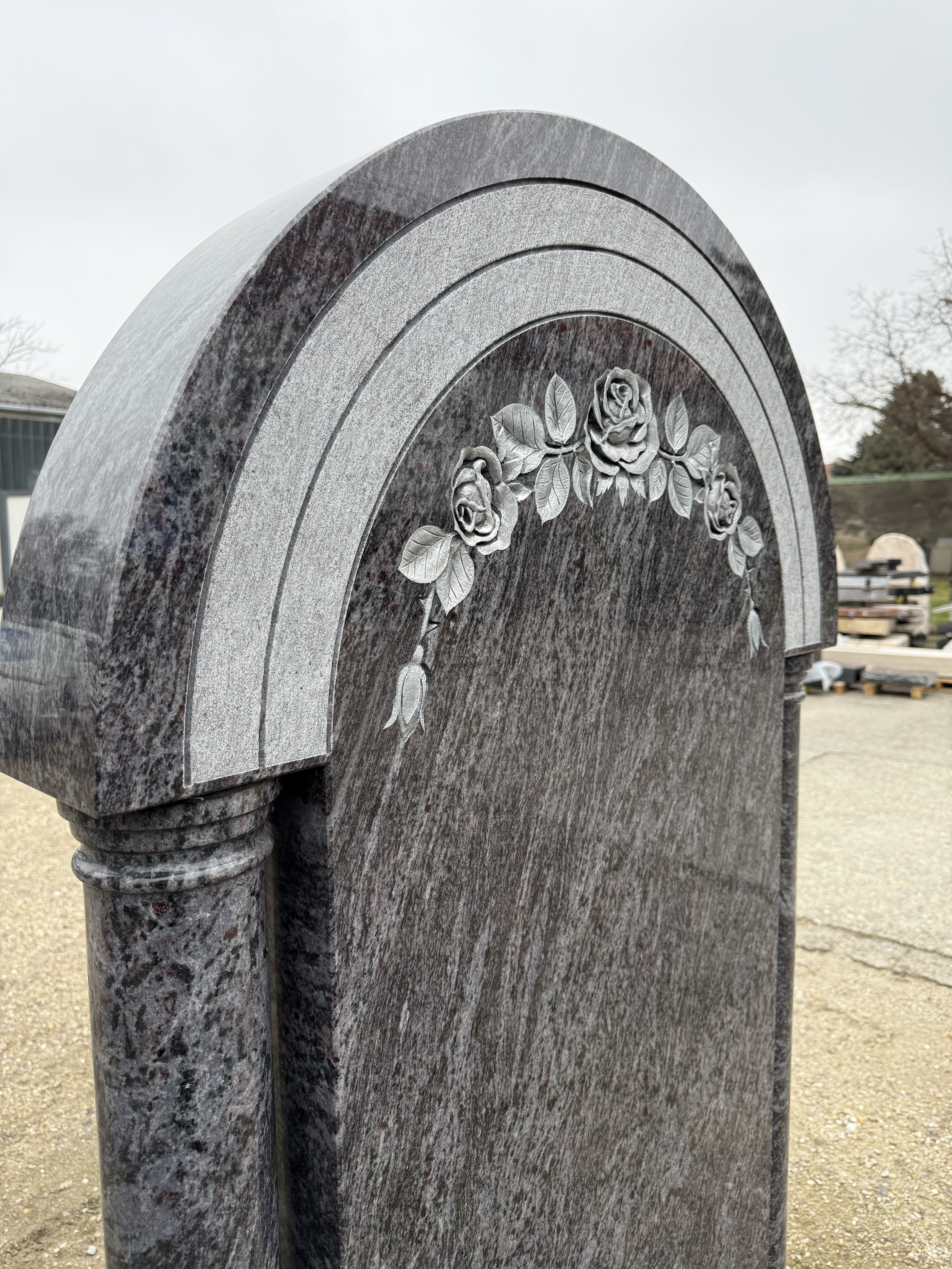 Dieser würdevolle Grabstein aus Orion Blue Granit setzt ein klassisches Zeichen des Gedenkens. Gerahmt von zwei eleganten Säulen, besticht das Denkmal durch seine erhabene Form. Ein kunstvoll gearbeitetes Rosenornament im oberen Bogen verleiht dem Grabmal eine sanfte, tröstliche Ausstrahlung. Dank der bemerkenswerten Härte und Beständigkeit dieses Natursteins bewahrt die Ruhestätte über Jahrzehnte ihre edle Ästhetik. Ein zeitloser Ort der liebevollen Erinnerung.