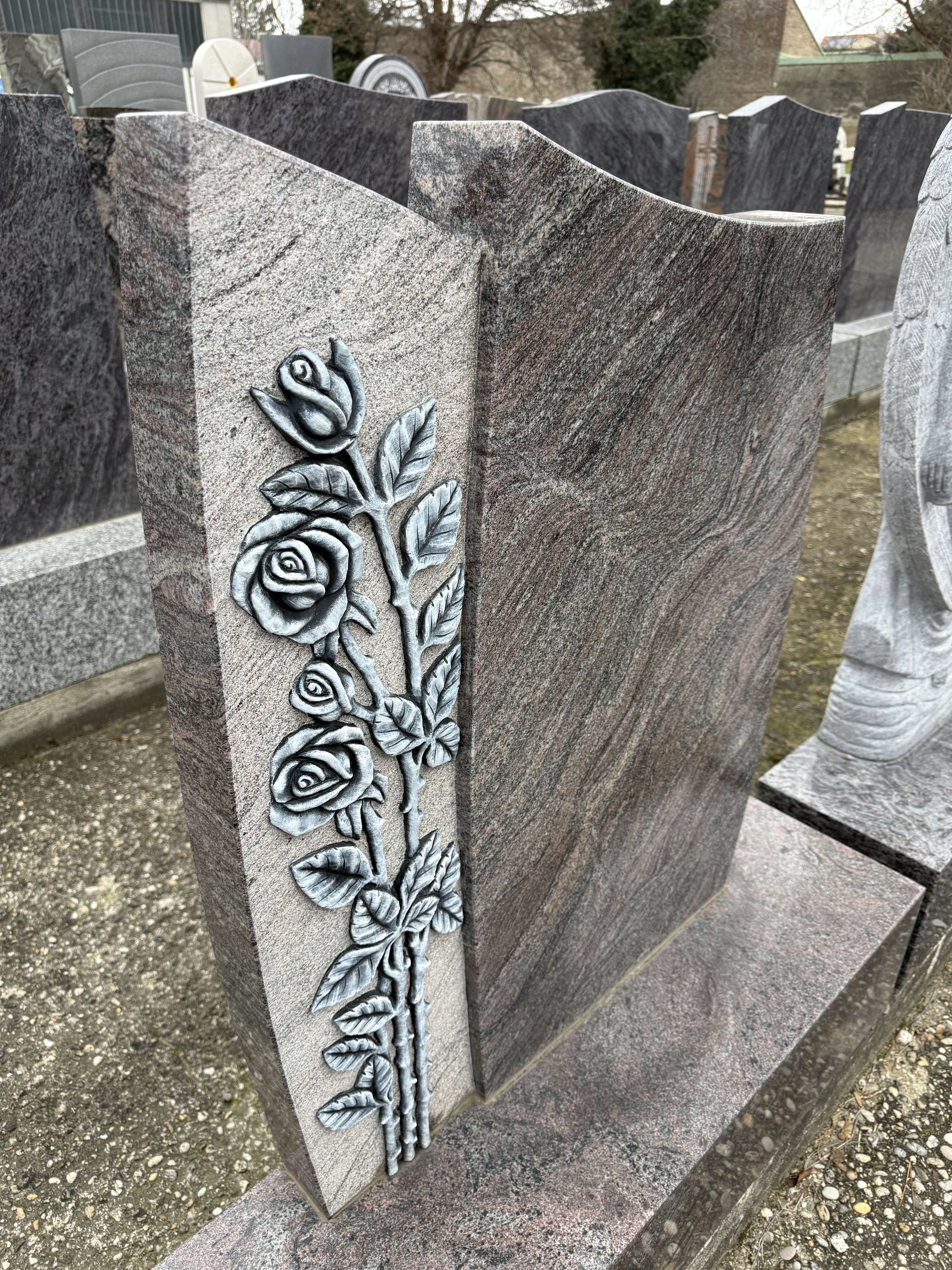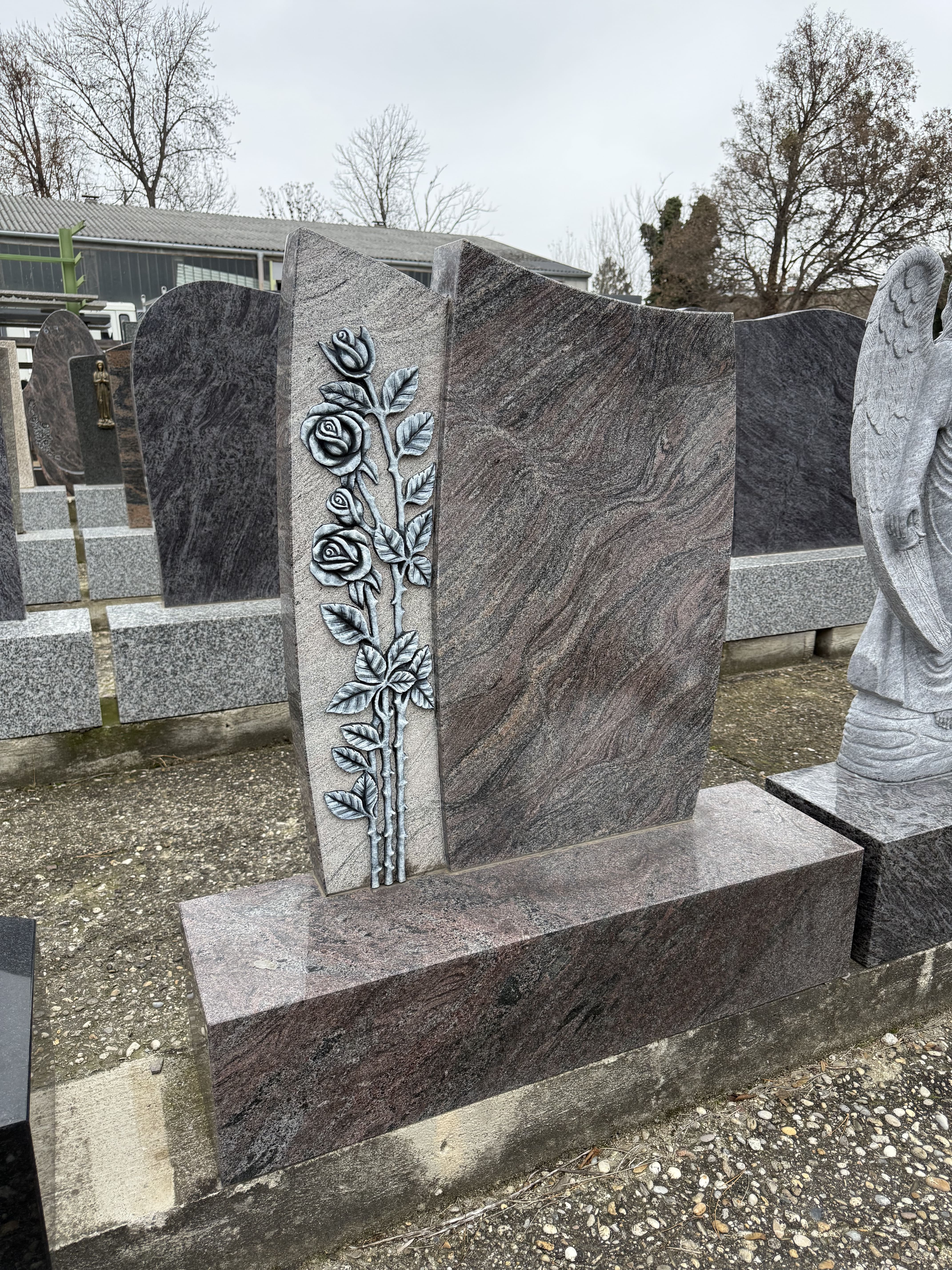 Dieser würdevolle Grabstein mit dazugehörigem Sockel aus edlem Paradiso Granit ist ein besonderes Zeichen der liebevollen Erinnerung. Die glänzend polierte Oberfläche bringt die warme, lebendige Maserung des Natursteins wunderbar zur Geltung. Ein meisterhaft handwerklich gearbeitetes Rosenornament ziert die Seite und verleiht dem Grabmal eine sanfte, tröstliche Ausstrahlung. Ein stilvoller und langlebiger Ort des Gedenkens für die letzte Ruhestätte.